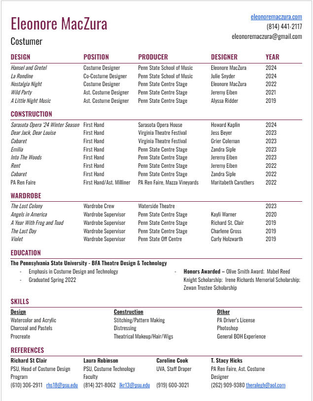 Hello! I am Eleonore MacZura, Costume Designer and Technician. Having obtained my BFA in Theatre Design and Technology at The Pennsylvania State University, I am a working costume technician, with my most recent experiences at the Sarasota Opera 2024 Winter Season and Penn State School Of Music Spring Operas.
